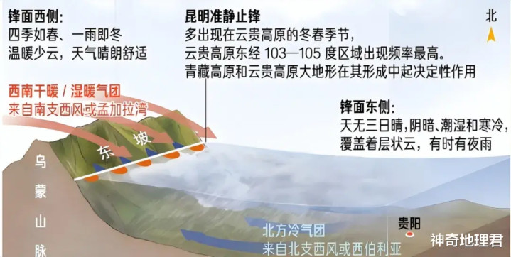 但最关键的,是它的海拔和地形。广东平均海拔才 218 米,广西 385 米,福建 482 米,而云南平均海拔高达 1892 米!地理老师都讲过 “海拔每升 100 米,气温降 0.6℃”,这么算下来,云南比两广地区直接低了近 10℃,夏天自然凉快。到了冬天更绝,乌蒙山像一堵 “挡风墙”,把北方来的冷空气拦在外面,形成 “云贵准静止锋”—— 锋面北边的贵州又冷又潮,南边的云南却被暖气团罩着,1 月最低温都在 5℃以上。全省年平均气温 15℃左右,夏天最高温极少超 28℃,这舒服劲儿,可不是随便哪个省能比的。